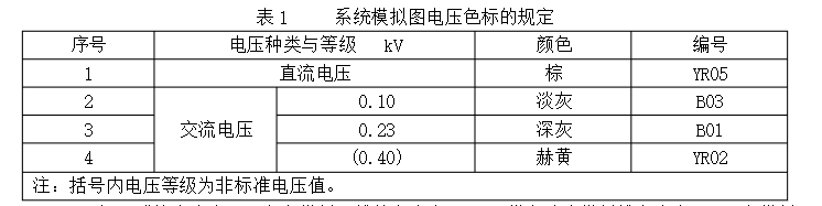 10.3體系模擬圖應(yīng)依據(jù)運轉(zhuǎn)電壓等級,按表1規(guī)則的色彩標明,色彩所對應(yīng)的色標,由制作廠或制作廠與用戶之間洽談確定。