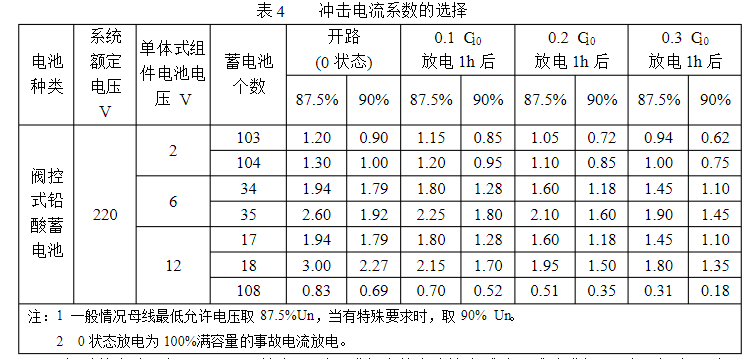 鉛酸蓄電池的事端放電能力試驗的沖擊電流應(yīng)根據(jù)蓄電池放電狀況、放電的停止電壓和蓄電池組的個數(shù)來挑選,其事端放電沖擊電流系數(shù)由表4來確認。