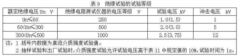 以上所列部位,應(yīng)能承受頻率為50Hz±5Hz之間,表9所列的正弦波實驗電壓值(也可采用直流電壓),歷時1min的實驗,絕緣不該出現(xiàn)擊穿或閃絡(luò)現(xiàn)象。