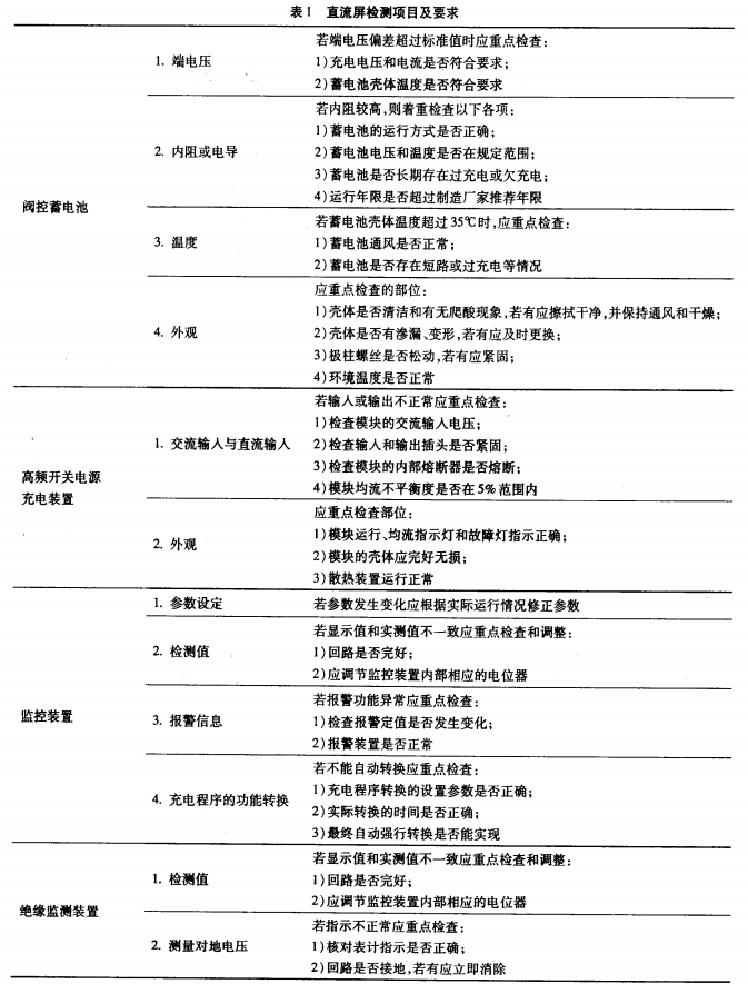 在建立完善的點(diǎn)檢準(zhǔn)則之前,首要有必要制定契合現(xiàn)場要求,并可以作為依據(jù)的設(shè)備檢修規(guī)范。在直流屏規(guī)范中規(guī)矩了直流電源系統(tǒng)設(shè)備檢修的基本要求,檢修前的預(yù)備、檢測項目、充放電試驗等內(nèi)容。直流屏主要由蓄電池.高頻開關(guān)電源充電設(shè)備,監(jiān)控設(shè)備、絕緣監(jiān)測設(shè)備4部分組成,見表1。