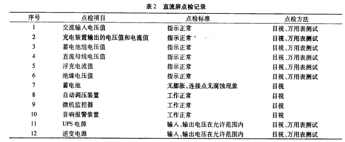 首要需求編制點(diǎn)檢規(guī)范,編制出符合實際出產(chǎn)需求的點(diǎn)檢規(guī)范,使其他點(diǎn)檢者能快速、簡潔執(zhí)行點(diǎn)檢規(guī)范。點(diǎn)檢規(guī)范的內(nèi)容觸及方面比較多,列入點(diǎn)檢處理規(guī)模的部位也比較多,例如直流屏,溝通輸入電壓值、充電裝置輸出的電壓值和電流值、蓄電池組電壓值、直流母線電壓值、浮充電流值、絕緣電壓值、蓄電池、自動調(diào)壓裝置、微機(jī)監(jiān)控器、音響報警裝置、UPS電源、逆變電源等都是關(guān)系到直流屏安全運(yùn)轉(zhuǎn)的重要參數(shù)及裝置,確定為點(diǎn)檢部位。點(diǎn)檢部位確定后,就要落實點(diǎn)檢內(nèi)容,點(diǎn)檢辦法目前還是以簡單東西、儀器和人的感觀為主的點(diǎn)檢辦法。因而,點(diǎn)檢內(nèi)容首要是查看設(shè)備溫度、電壓、表計指示、工作狀況等方面參數(shù)。直流屏設(shè)備點(diǎn)檢工作首要是以日常點(diǎn)檢為主,定時點(diǎn)檢為輔。日常點(diǎn)檢首要以人的感官為主,經(jīng)過聽、摸、看.擰等辦法對運(yùn)轉(zhuǎn)中的設(shè)備進(jìn)行一個外觀的查看。經(jīng)過每日進(jìn)行的點(diǎn)檢工作,及時發(fā)現(xiàn)設(shè)備存在的危險并消除,使設(shè)備長周期安全運(yùn)轉(zhuǎn)。由于直流屏的特殊性,展開的直流屏設(shè)備專業(yè)點(diǎn)檢也很重要,點(diǎn)檢辦法以工用具、外表和人的感觀為主的點(diǎn)檢辦法。經(jīng)過定時進(jìn)行的點(diǎn)檢工作,及時發(fā)現(xiàn)設(shè)備存在的危險并消除,使設(shè)備長周期安全運(yùn)轉(zhuǎn),見表2。