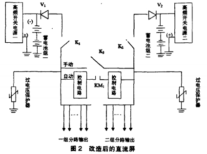 改善后的直流屏添加刀閘K1、K2、K3,兩個隔絕二極管V1、V2,直流接觸器KM,及控制回路。這樣能更好地控制電源的輸人切換,便于維護。
