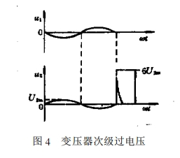 另一方面,直流屏變壓器交流側(cè)也會由于大容量負(fù)載如大變比變壓器的合閘瞬間、其它負(fù)載堵截電源時以及整流變壓器電刀閘的開關(guān)斷開,也會由于初次級繞組間的分布電容,變壓器的鼓勵電流的驟變在次級產(chǎn)生瞬時過電壓,其尖峰值可達(dá)作業(yè)電壓峰值的6倍以上,如圖4所示。